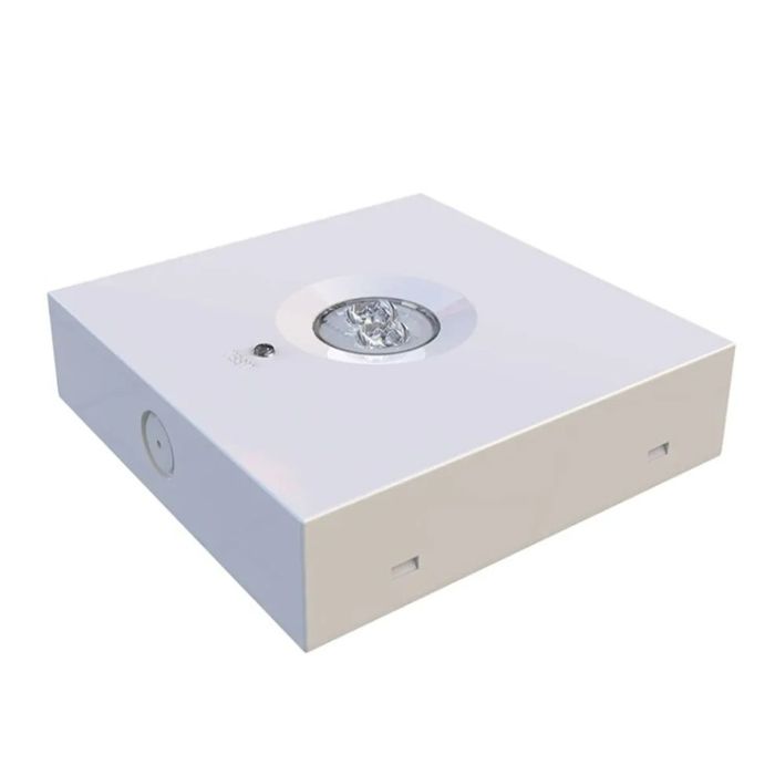 Deze witte opbouw noodverlichting is ontworpen voor betrouwbare vluchtwegverlichting in gebouwen. Het armatuur is geschikt voor plafondmontage en werkt zowel in continu of alleen bij stroomuitval. Dankzij de geïntegreerde LED-lichtbron met een lichtopbrengst van 240 lumen en een kleurtemperatuur van 5000 Kelvin biedt het helder, neutraal wit licht dat goed zichtbaar is bij noodsituaties.